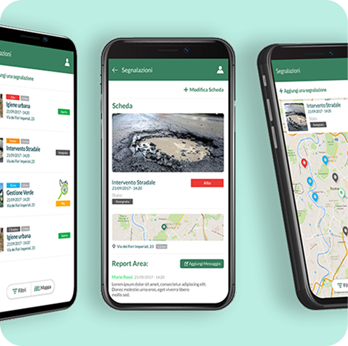 APP MOBILE: permette agli operatori di inviare tramite smartphone segnalazioni durante i giri di controllo, di gestire immediatamente le problematiche riscontrate, di assegnare le attività ad altri operatori. GESTIONALE WEB: permette agli amministratori di gestire centralmente le segnalazioni, assegnare priorità, assegnare attività agli operatori sul territorio.